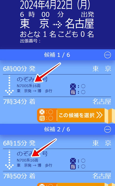 予約する列車の種類がこのように判別できます。画面例は有料会員向けのEX予約ですが、無料会員用のスマートEXでも同じです。
